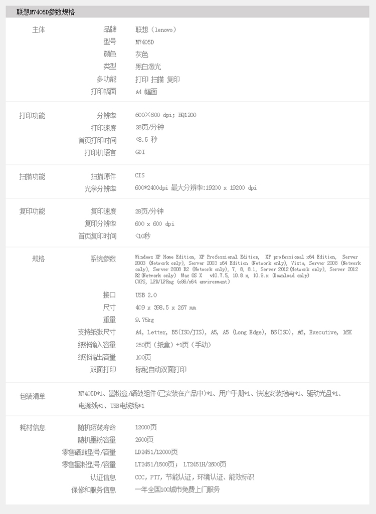 • 產(chǎn)品名稱:聯(lián)想(Lenovo)M7405D激光黑白一體機(jī)