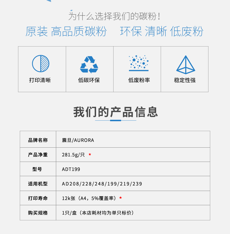 • 產(chǎn)品名稱:震旦ADT-199 復(fù)印機(jī)耗材粉盒碳粉適用AD199 208 228 248 219 239