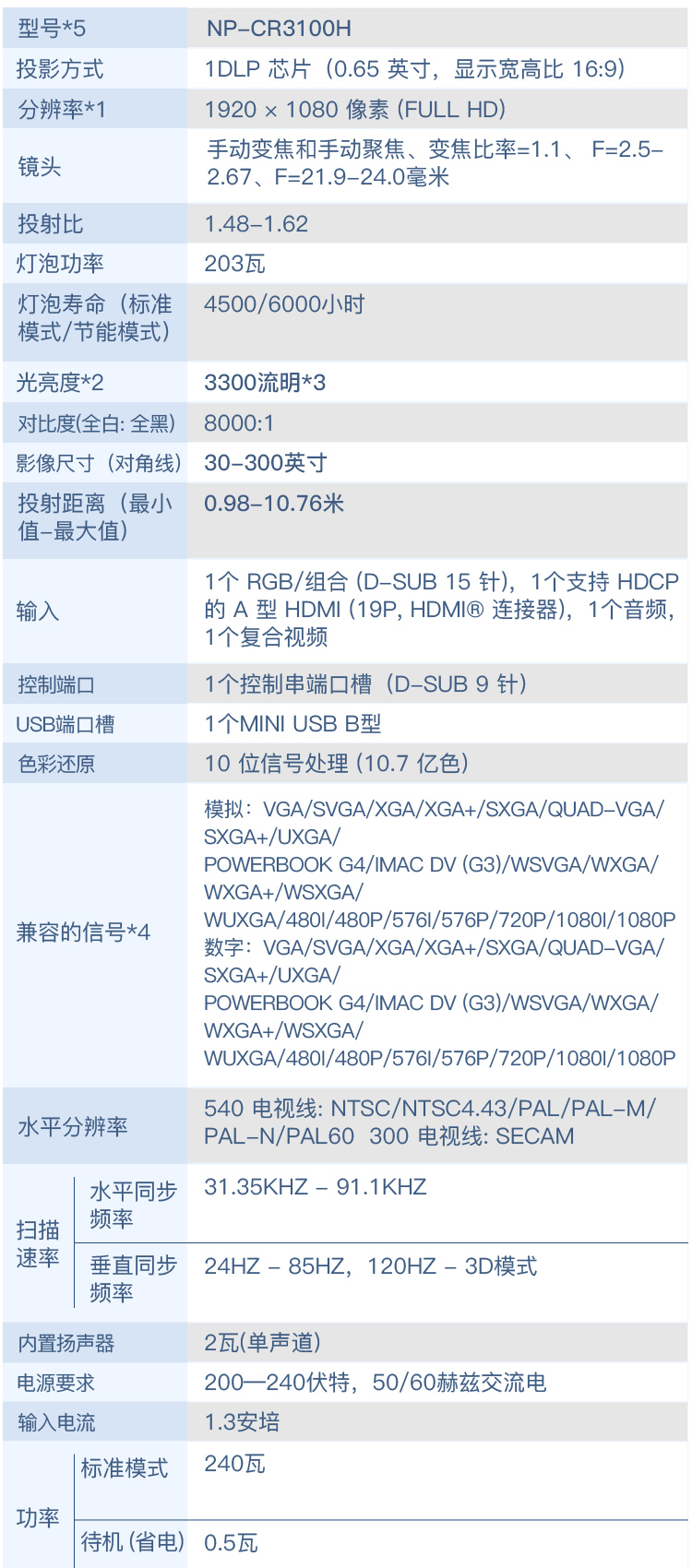 • 產(chǎn)品名稱:NEC NP- CR3100H 投影機(jī)家用 全高清投影儀(1080P 2800流明 )