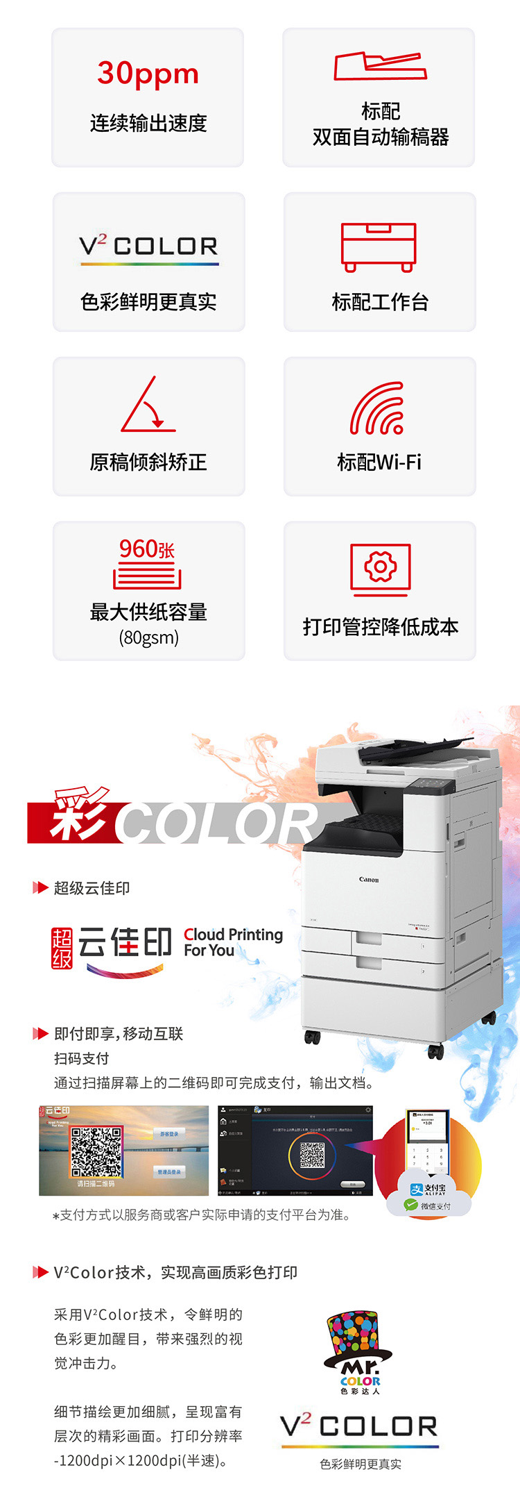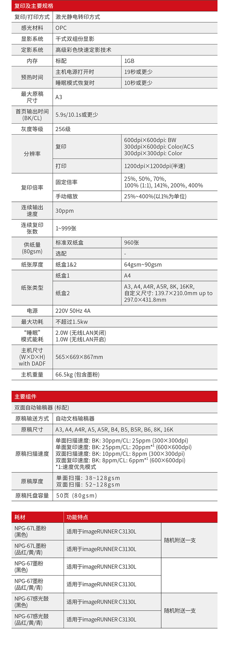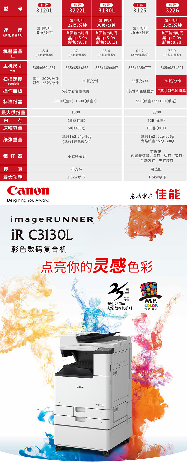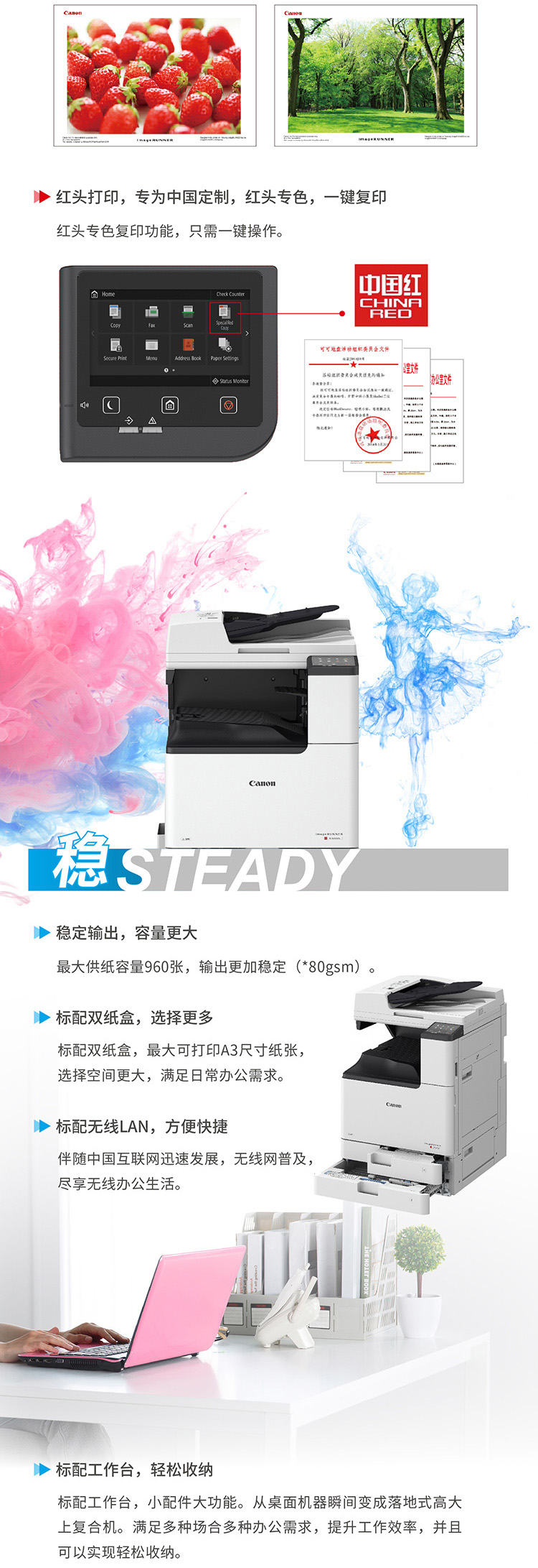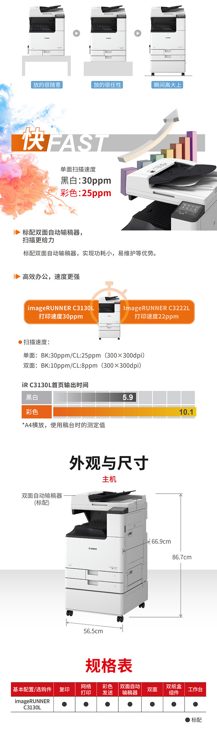 • 產(chǎn)品名稱:佳能(Canon)大型打印機(jī)iRC3130L/3222L/3226商用辦公a3a4彩色復(fù)合復(fù)印機(jī)(雙面打印/掃描)含雙面自動(dòng)輸稿器工作臺(tái)