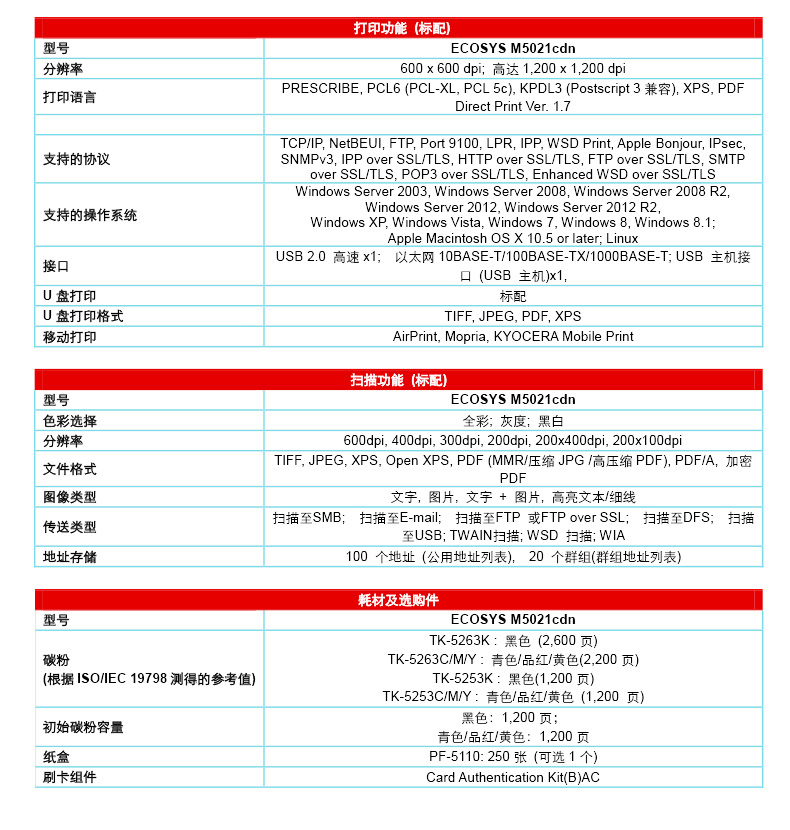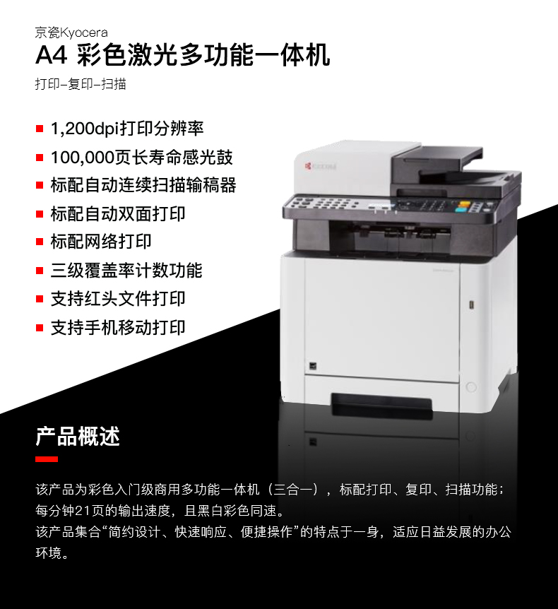 • 產(chǎn)品品牌:京瓷(KYOCERA)M5021cdn多功能一體機